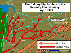 The 5th Canadian Brigade made the move into Germany on 19 April 1945, concentrating 40 kilometres southwest of Bremen. The entire Division would move in bounds, protecting the right flank of 4th Canadian (Armoured) Division, itself advancing on the flank of the British XXX Corps moving on Bremen. The 5th Brigade moved on 22 April, with The Calgary Highlanders in the lead. “C” and “D” Companies led the advance mounted on tanks of the Fort Garry Horse. Only three casualties were suffered in the days’ advance when a carrier driven by Private Leonard W. Pepper was ambushed. Captain Bill Lyster was severely wounded, almost losing his arm and being evacuated to England.